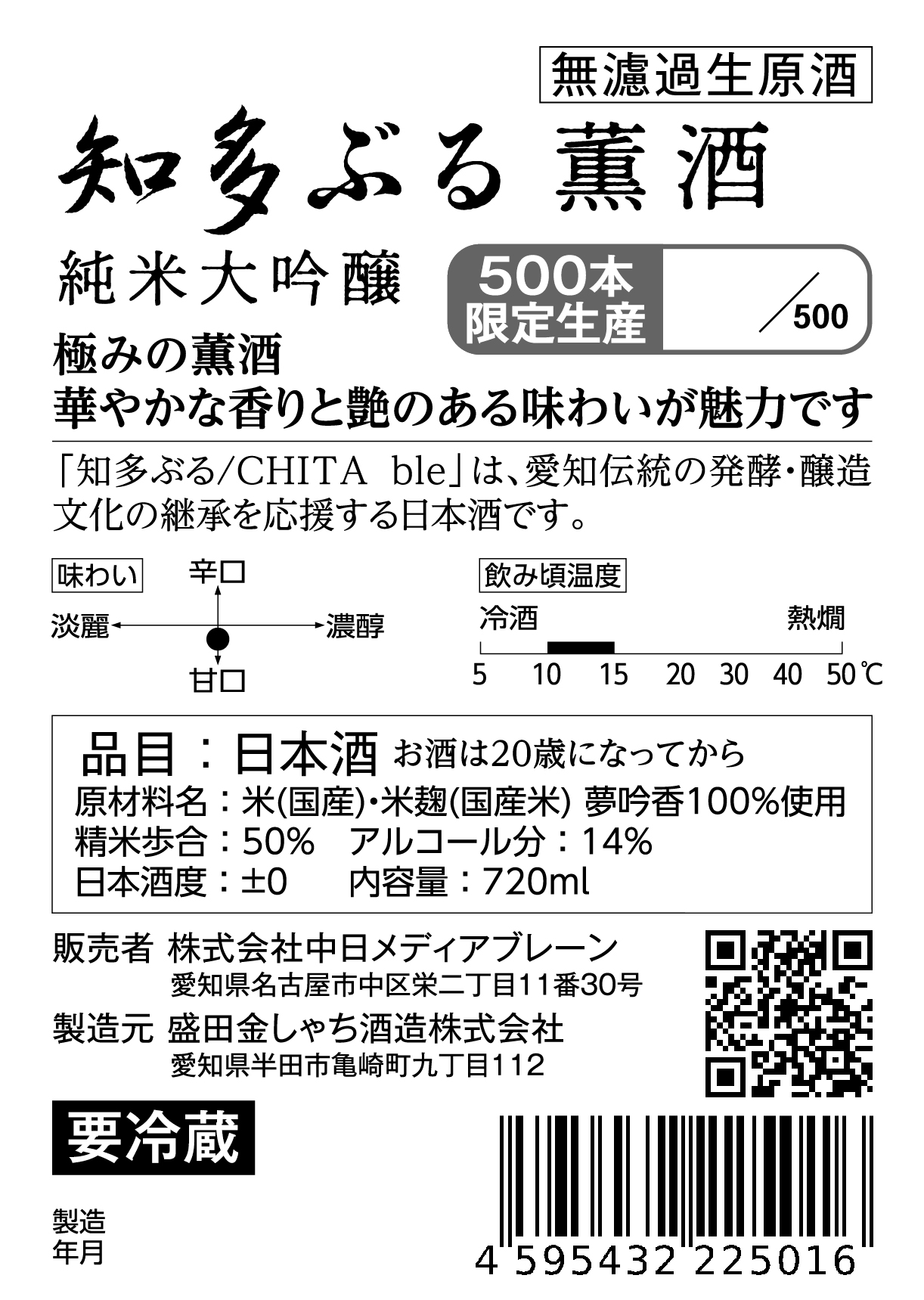 日本と知多が誇る発酵・醸造文化のサステナブルに願いを込め、「知多ぶる/CHITA ble」と名付けました。知多の杜氏と米生産者が丹精込めて作った限定各500本の逸品です。